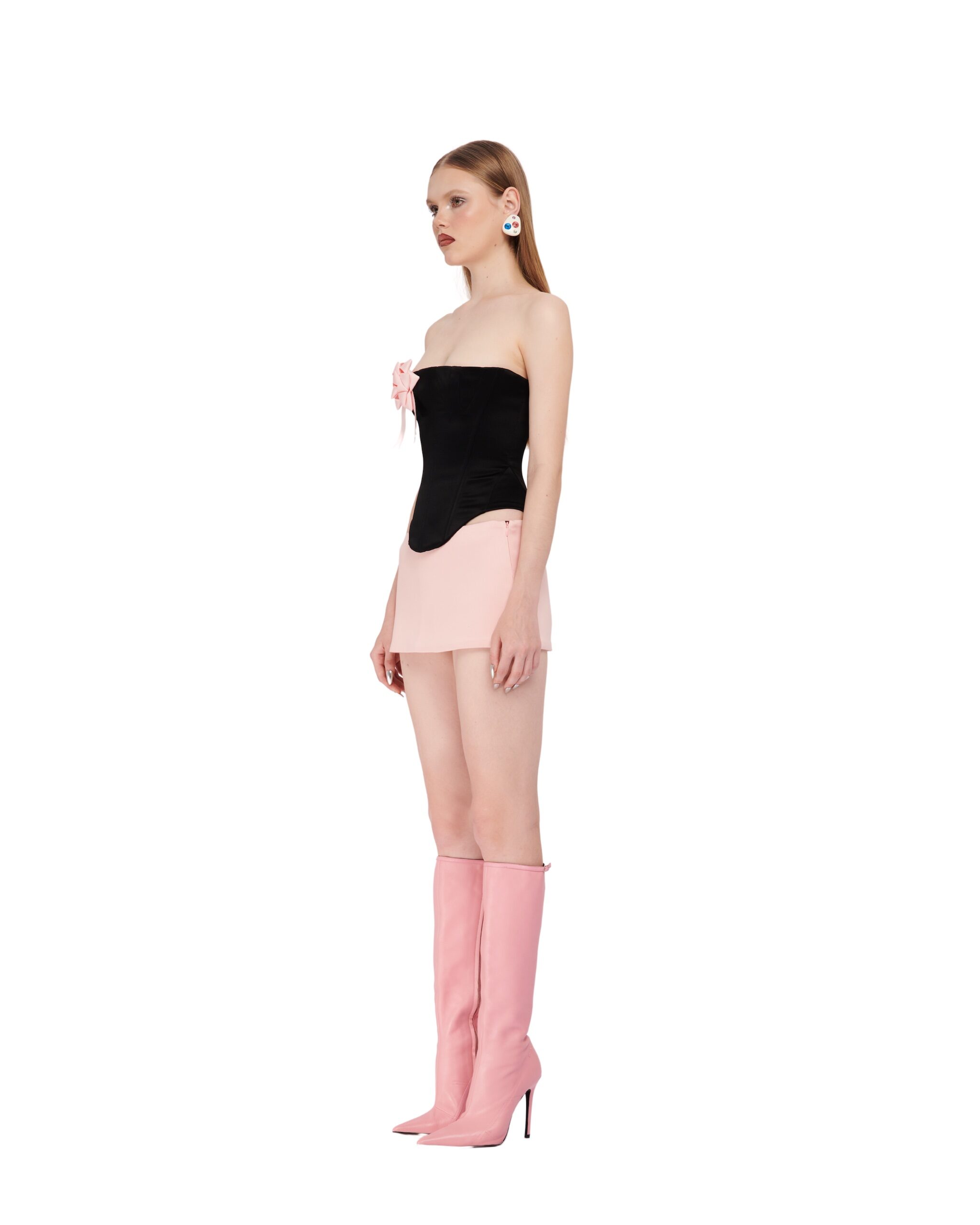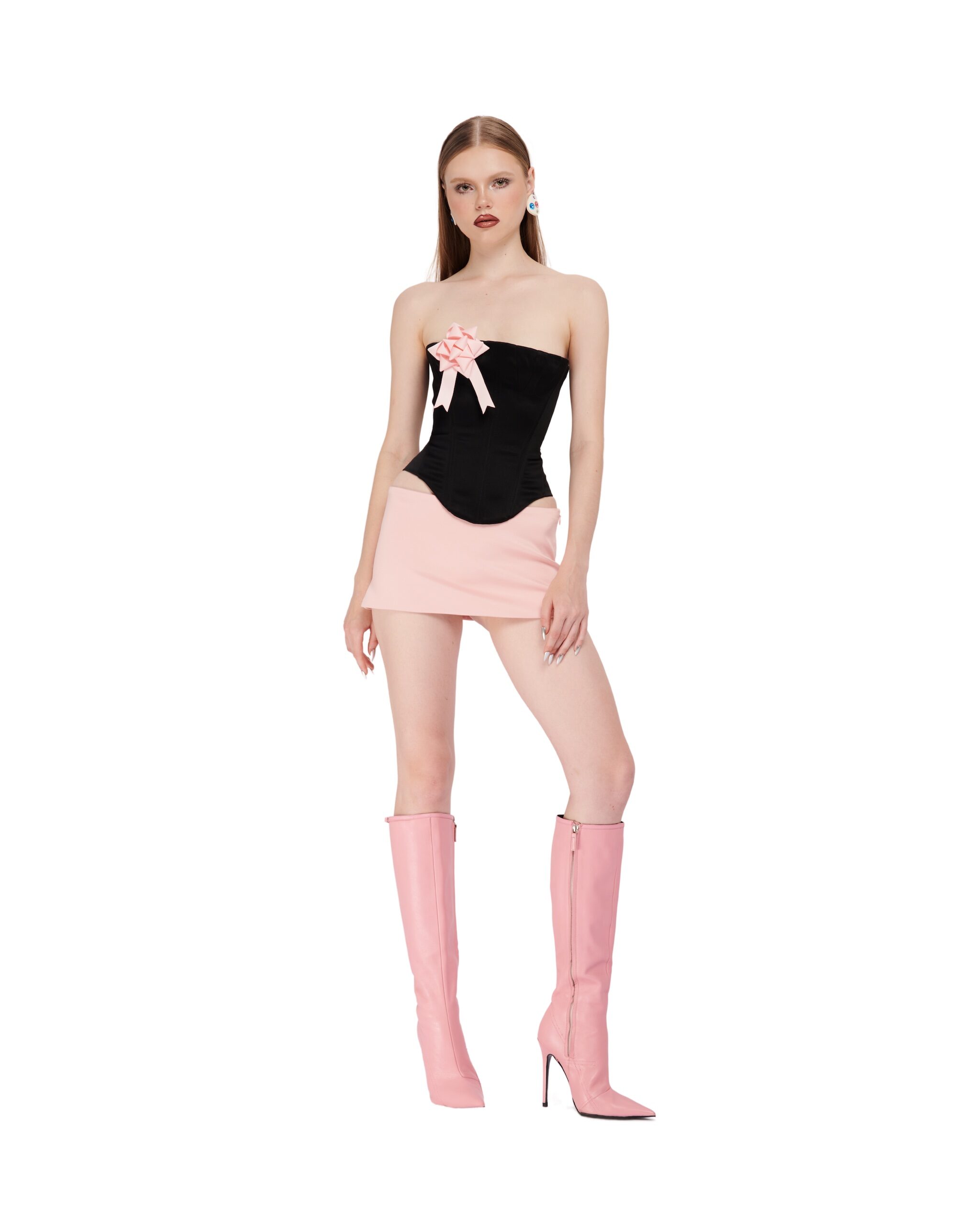 Double-layered satin corset with ribbon details.