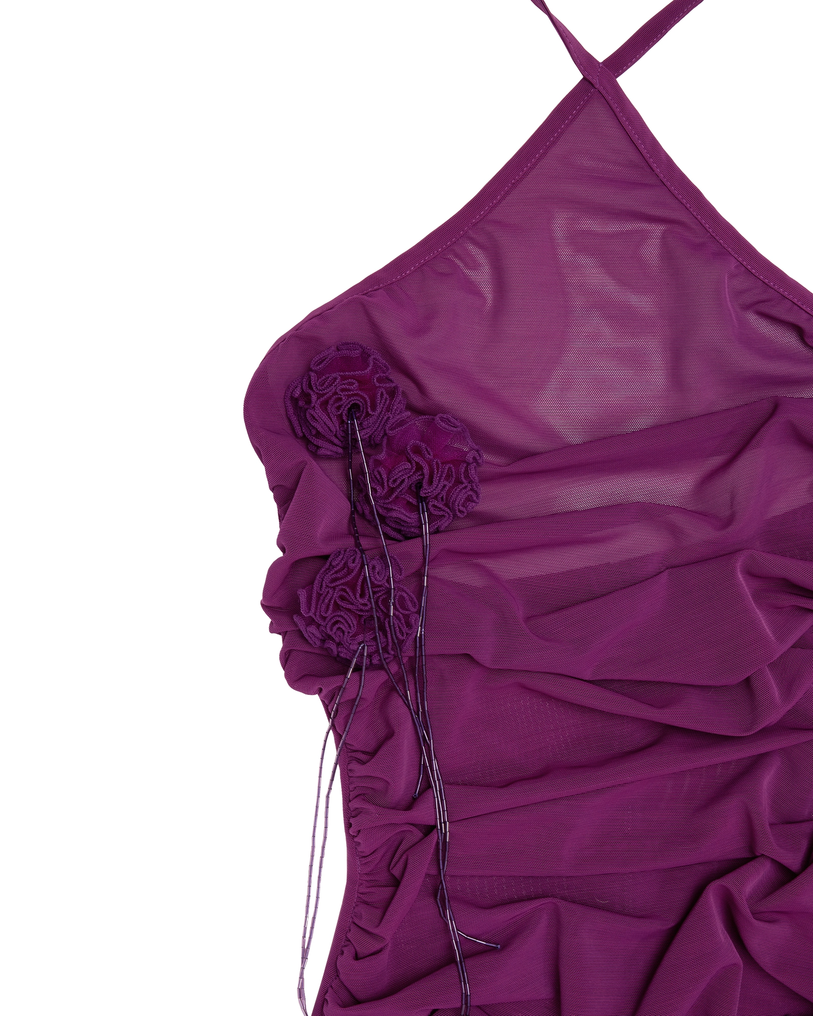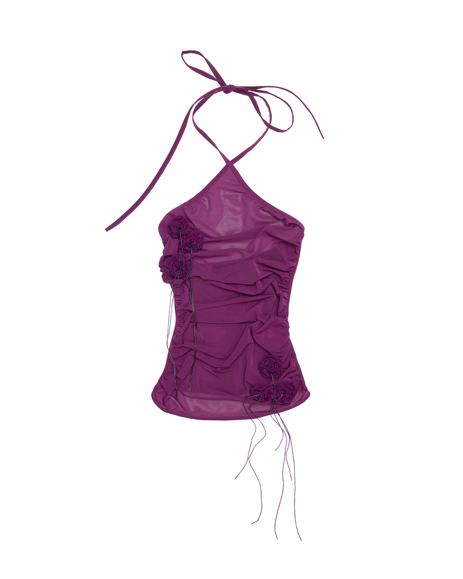 Semi-sheer stretch nylon mesh halter strap top with handmade rosette
